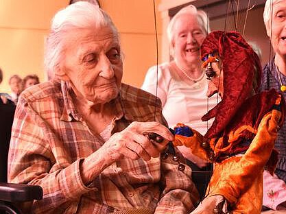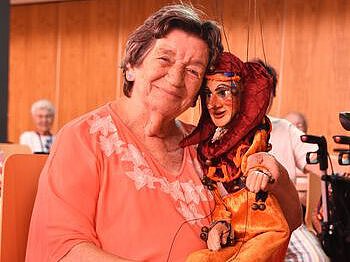 Unsere Bewohner*innen genossen eine Vorstellung vom Rumpelstilzchen frei nach den Gebrüdern Grimm. Faszinierend war, wie flink und geschickt die Puppenspielerinnen ihre Figuren an den Fäden auf der kleinen Bühne lenkten. Die Inszenierung mit den lebhaften Puppenspiel verzauberte alle im Nu und verwandelte den Alltag der Bewohner*innen für kurze Zeit selbst ein bisschen in ein Märchen.
